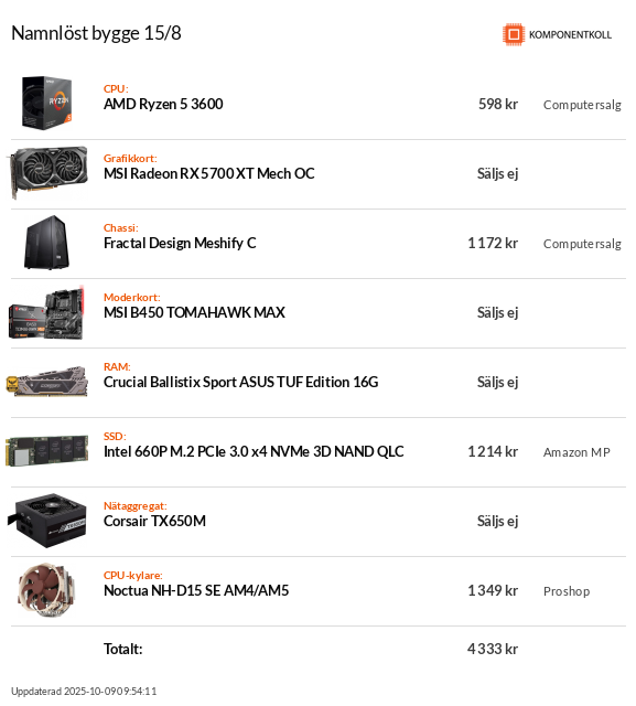 CPU: i9-9900K + Be Quiet! Dark Rock Pro 3. Moderkort: ASUS ROG Z390-F. Minnen: Corsair Vengeance DDR4 2x8GB 3000MHz. GPU: GigaByte RTX 3080 Gaming OC. SSD: Corsair MP510 500GB. HDD: WD Blue 3TB Nätagg: EVGA SuperNova G2 850W. Chassi: Corsair 4000D Airflow.