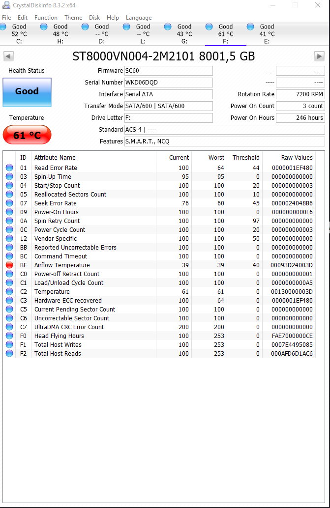 Gällande Seagate att du har siffror högre än 0 på RAW på ID 1, ID 7 och ID C3 så räknas inte de 8 lägsta hexadecimala sifforna ( 32bit) - medans börja de 4 högsta siffrorna stega upp så är det ett problem. det är lite olika mellan disktillverkarna i hur siffrorna skall tolkas.