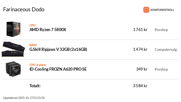 Chassi: Fractal Design North Grafikkort: Radeon 9070 XT Red Devil CPU: Intel Core i5 14600k CPU-kylare: Noctua NH-D15 Moderkort: msi pro Z690-A Ram: Corsair Vengeance DDR4 32GB Nätagg: Seasonic Focus GX 850