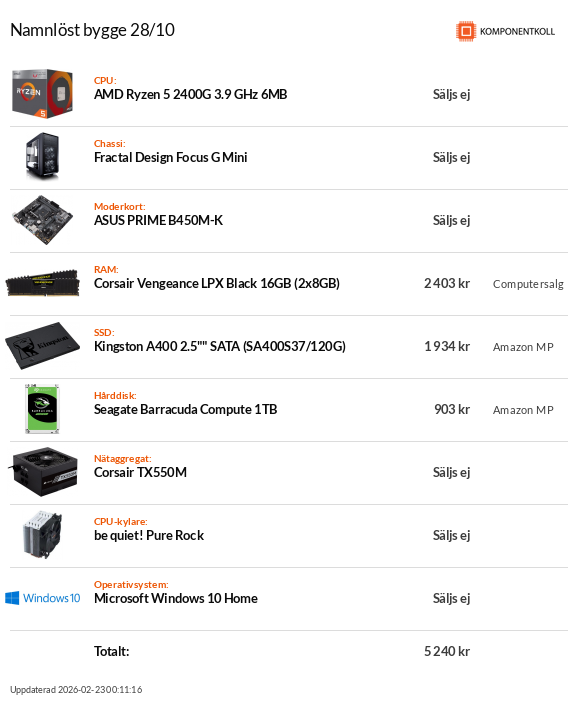 CPU: Ryzen 5 5600 | GPU: ASUS RX 6700 XT | RAM: 16GB 3000MHz DDR4 | Mobo: ASUS B550-Plus | Lagring: 2x1TB SSD | Chassi: Fractal Meshify 2 | PSU: EVGA Supernova G6 1000W |