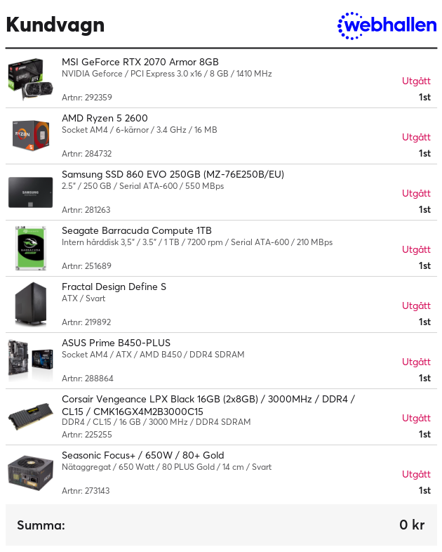 CPU: Ryzen 5 5600 | GPU: ASUS RX 6700 XT | RAM: 16GB 3000MHz DDR4 | Mobo: ASUS B550-Plus | Lagring: 2x1TB SSD | Chassi: Fractal Meshify 2 | PSU: EVGA Supernova G6 1000W |