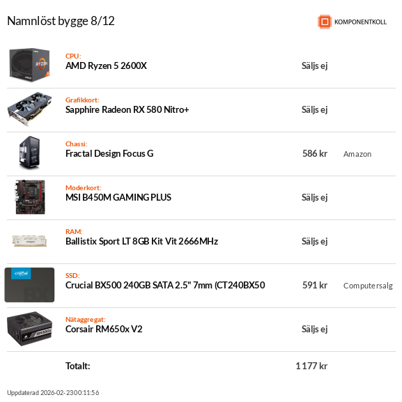 CPU: Ryzen 5 5600 | GPU: ASUS RX 6700 XT | RAM: 16GB 3000MHz DDR4 | Mobo: ASUS B550-Plus | Lagring: 2x1TB SSD | Chassi: Fractal Meshify 2 | PSU: EVGA Supernova G6 1000W |