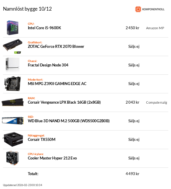CPU: i9-9900K + Be Quiet! Dark Rock Pro 3. Moderkort: ASUS ROG Z390-F. Minnen: Corsair Vengeance DDR4 2x8GB 3000MHz. GPU: GigaByte RTX 3080 Gaming OC. SSD: Corsair MP510 500GB. HDD: WD Blue 3TB Nätagg: EVGA SuperNova G2 850W. Chassi: Corsair 4000D Airflow.