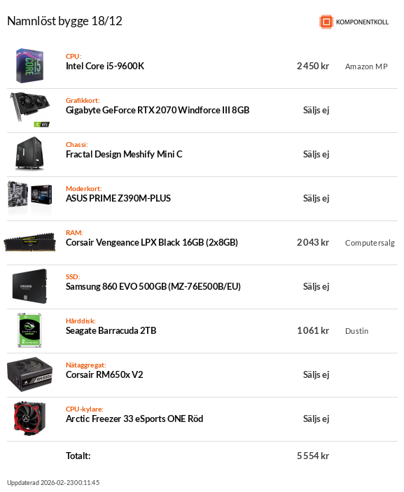 CPU: i9-9900K + Be Quiet! Dark Rock Pro 3. Moderkort: ASUS ROG Z390-F. Minnen: Corsair Vengeance DDR4 2x8GB 3000MHz. GPU: GigaByte RTX 3080 Gaming OC. SSD: Corsair MP510 500GB. HDD: WD Blue 3TB Nätagg: EVGA SuperNova G2 850W. Chassi: Corsair 4000D Airflow.