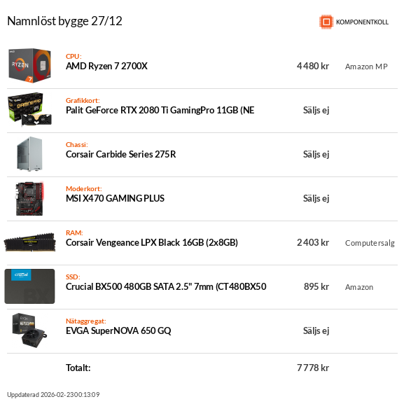 CPU: i9-9900K + Be Quiet! Dark Rock Pro 3. Moderkort: ASUS ROG Z390-F. Minnen: Corsair Vengeance DDR4 2x8GB 3000MHz. GPU: GigaByte RTX 3080 Gaming OC. SSD: Corsair MP510 500GB. HDD: WD Blue 3TB Nätagg: EVGA SuperNova G2 850W. Chassi: Corsair 4000D Airflow.
