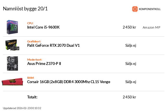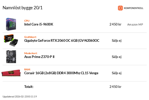 CPU: i9-9900K + Be Quiet! Dark Rock Pro 3. Moderkort: ASUS ROG Z390-F. Minnen: Corsair Vengeance DDR4 2x8GB 3000MHz. GPU: GigaByte RTX 3080 Gaming OC. SSD: Corsair MP510 500GB. HDD: WD Blue 3TB Nätagg: EVGA SuperNova G2 850W. Chassi: Corsair 4000D Airflow.