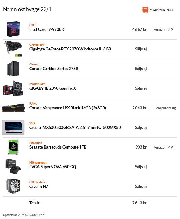 CPU: i9-9900K + Be Quiet! Dark Rock Pro 3. Moderkort: ASUS ROG Z390-F. Minnen: Corsair Vengeance DDR4 2x8GB 3000MHz. GPU: GigaByte RTX 3080 Gaming OC. SSD: Corsair MP510 500GB. HDD: WD Blue 3TB Nätagg: EVGA SuperNova G2 850W. Chassi: Corsair 4000D Airflow.