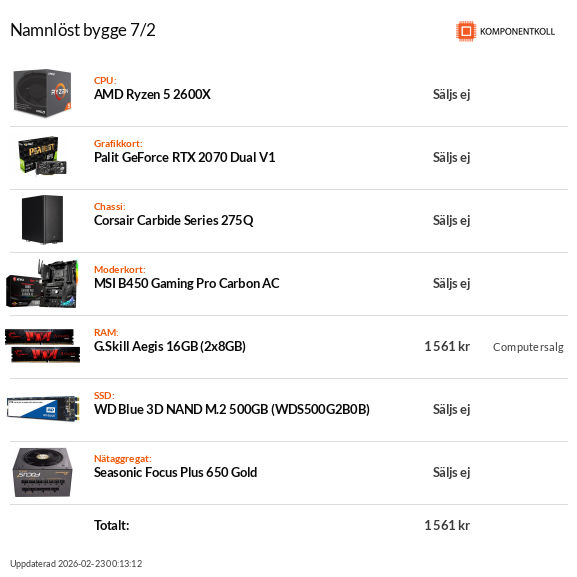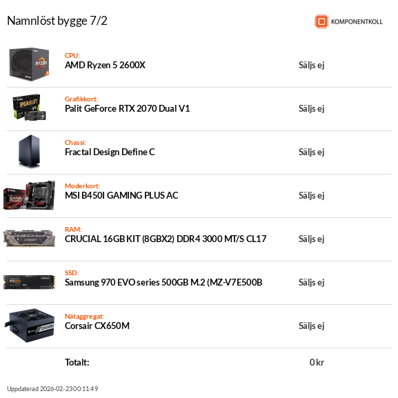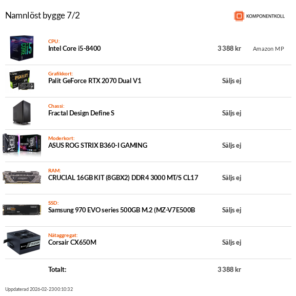 CPU: i9-9900K + Be Quiet! Dark Rock Pro 3. Moderkort: ASUS ROG Z390-F. Minnen: Corsair Vengeance DDR4 2x8GB 3000MHz. GPU: GigaByte RTX 3080 Gaming OC. SSD: Corsair MP510 500GB. HDD: WD Blue 3TB Nätagg: EVGA SuperNova G2 850W. Chassi: Corsair 4000D Airflow.