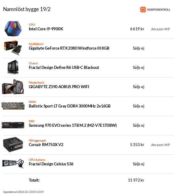 CPU: i9-9900K + Be Quiet! Dark Rock Pro 3. Moderkort: ASUS ROG Z390-F. Minnen: Corsair Vengeance DDR4 2x8GB 3000MHz. GPU: GigaByte RTX 3080 Gaming OC. SSD: Corsair MP510 500GB. HDD: WD Blue 3TB Nätagg: EVGA SuperNova G2 850W. Chassi: Corsair 4000D Airflow.