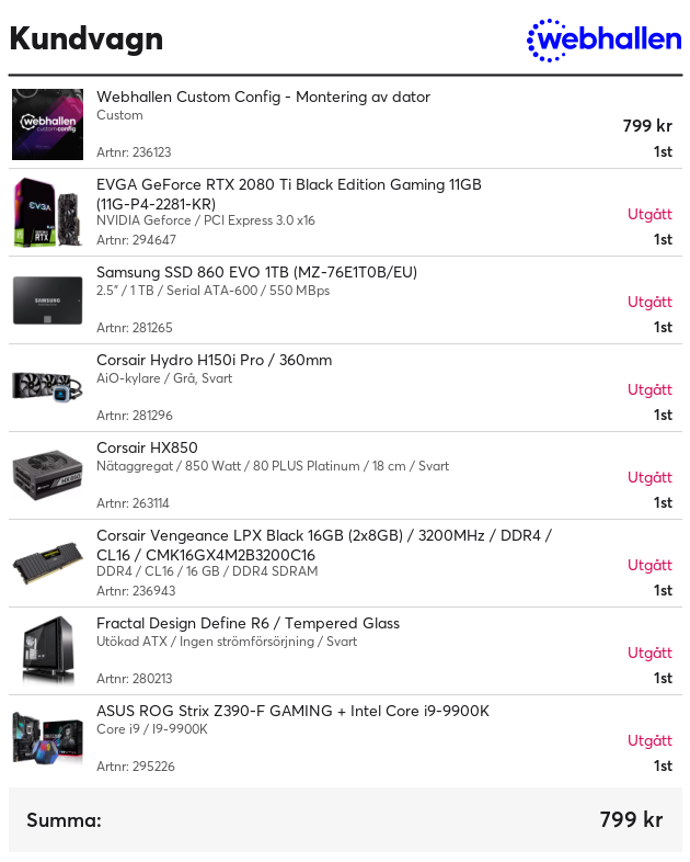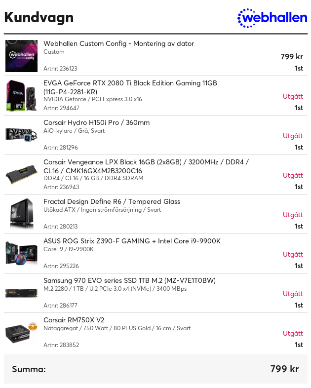 CPU: i9-9900K + Be Quiet! Dark Rock Pro 3. Moderkort: ASUS ROG Z390-F. Minnen: Corsair Vengeance DDR4 2x8GB 3000MHz. GPU: GigaByte RTX 3080 Gaming OC. SSD: Corsair MP510 500GB. HDD: WD Blue 3TB Nätagg: EVGA SuperNova G2 850W. Chassi: Corsair 4000D Airflow.