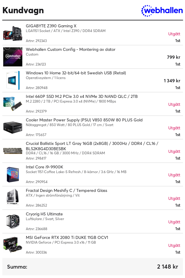 För själva datorn, jag skulle säga att det vore synd att hoppa över en 9900k i en dator i den här prisklassen. Den kostar en tusenlapp mer, men den kommer stå sig betydligt bättre och du skulle inte köpa ett grafikkort för 14-15k om du inte ville ha det bästa
