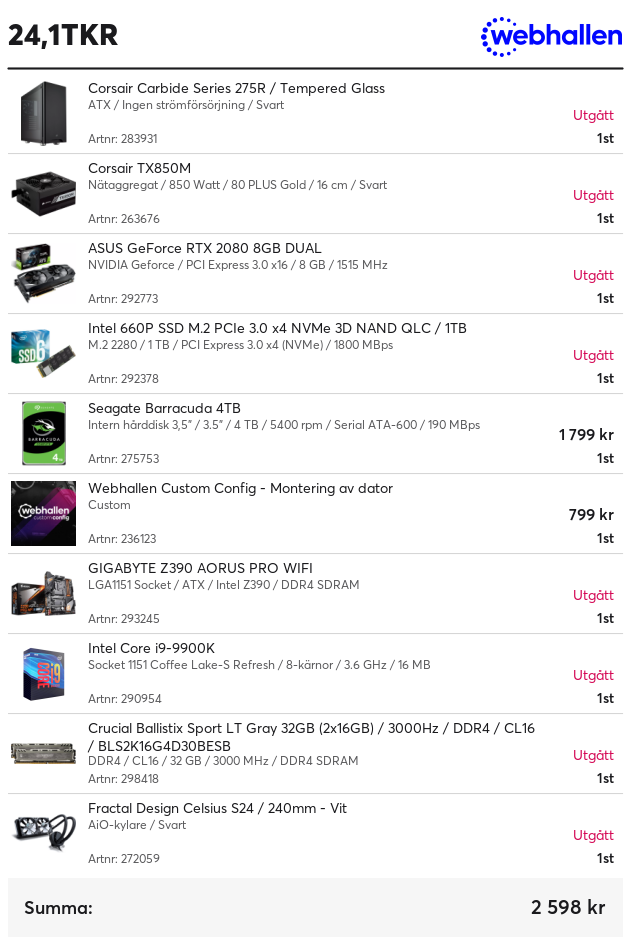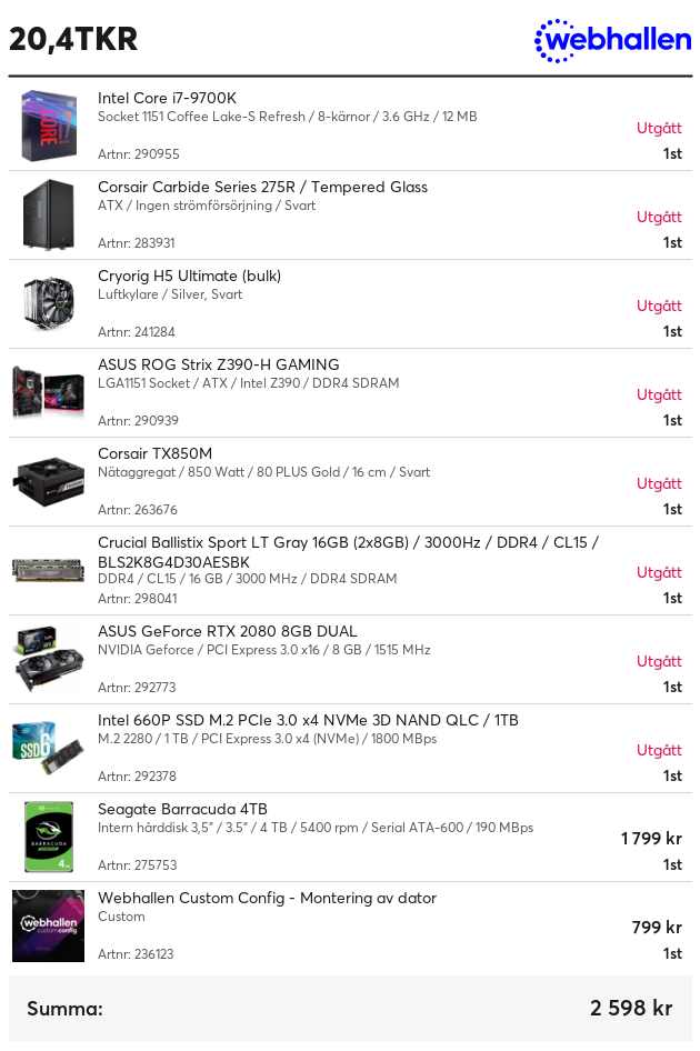 CPU: i9-9900K + Be Quiet! Dark Rock Pro 3. Moderkort: ASUS ROG Z390-F. Minnen: Corsair Vengeance DDR4 2x8GB 3000MHz. GPU: GigaByte RTX 3080 Gaming OC. SSD: Corsair MP510 500GB. HDD: WD Blue 3TB Nätagg: EVGA SuperNova G2 850W. Chassi: Corsair 4000D Airflow.
