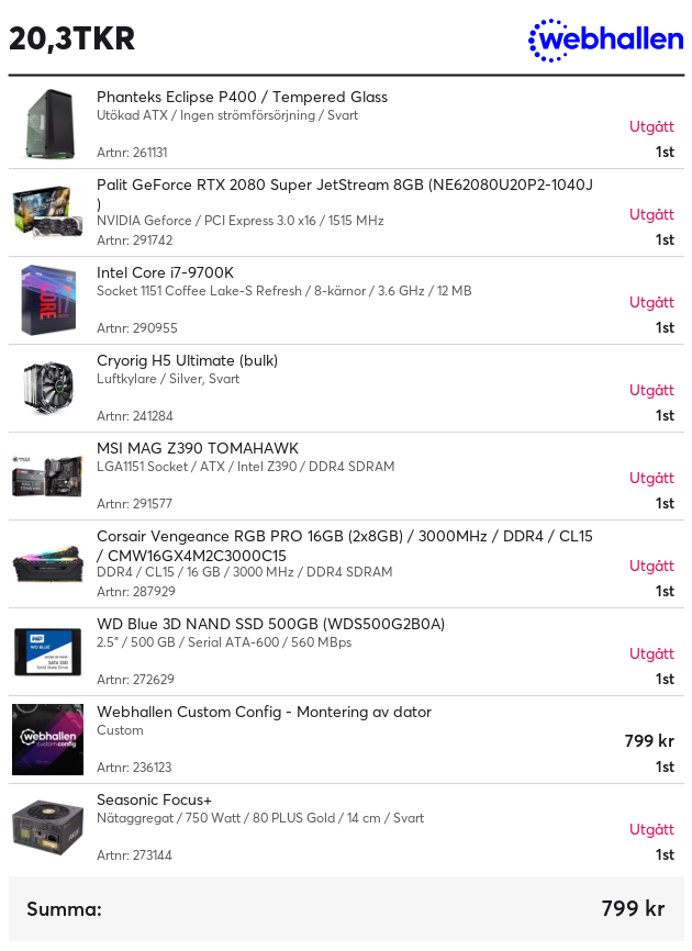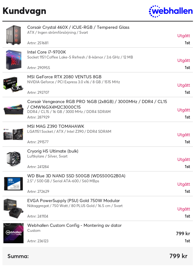 Alternativt 9700K och valfri gpu 2060 2070 2080 men observera ska du ta 9900K så ta det moderkortet jag har i listan tar du 9700K ta det som jag har i listan som jag gjorde innan.