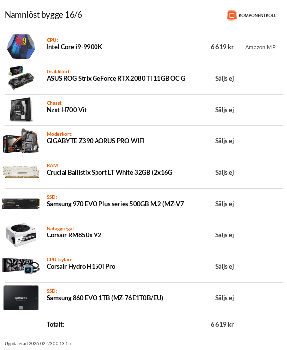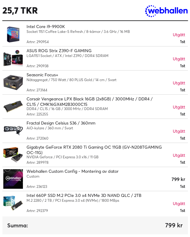 CPU: i9-9900K + Be Quiet! Dark Rock Pro 3. Moderkort: ASUS ROG Z390-F. Minnen: Corsair Vengeance DDR4 2x8GB 3000MHz. GPU: GigaByte RTX 3080 Gaming OC. SSD: Corsair MP510 500GB. HDD: WD Blue 3TB Nätagg: EVGA SuperNova G2 850W. Chassi: Corsair 4000D Airflow.