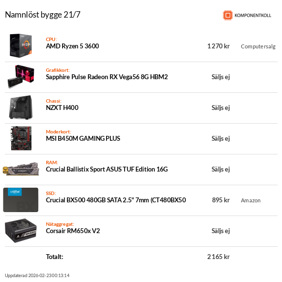 GPU: MSI GTX 1070 Aero 8 GB Nätagg: Corsair RM750X V2 OS disk: Samsung 750 EVO 256 GB Lagringsdisk: WD 1TBx2