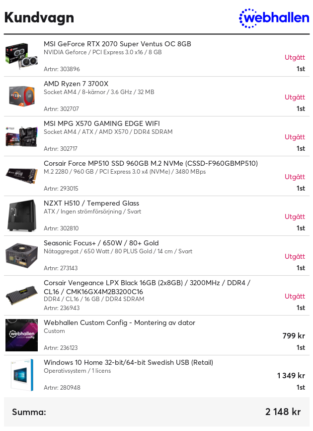 CPU: i9-9900K + Be Quiet! Dark Rock Pro 3. Moderkort: ASUS ROG Z390-F. Minnen: Corsair Vengeance DDR4 2x8GB 3000MHz. GPU: GigaByte RTX 3080 Gaming OC. SSD: Corsair MP510 500GB. HDD: WD Blue 3TB Nätagg: EVGA SuperNova G2 850W. Chassi: Corsair 4000D Airflow.