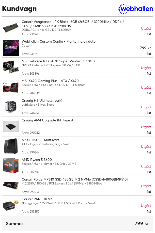 Jag kommer att köpa en ny setup, därmed blir det dags för ett nytt datorbygge. Jag är ute efter konstruktiv feedback och tips angående val av delar. Kort och gott är målet med datorn att spela 1440p i 144fps på relativt nya spel i high settings (känner inget behov av att maxa i ultra). Andra egenskaper jag vill att datorn ska ha är såklart att vara tyst och inte alltför stor, det chassit jag valt på 0.04 kubikmeter är det största jag kan tänka mig, gärna mindre.