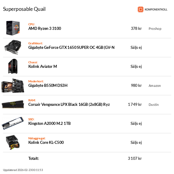Jag är lite på jakt efter en budget "speldator" som har möjligheter att uppgraderas i framtiden. Skulle säga att jag har typ as dålig koll på datorer och komponenter. Tar därfär gärna emot alla förslag, men motivera gärna så jag lär mig samtidigt! Efter lite letande och tittande, så har jag väl kommit fram till följande.