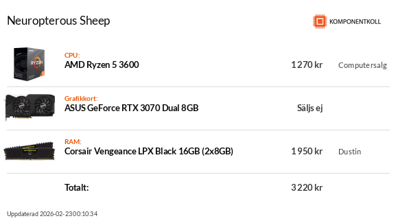 Har haft dessa GPUer: Tseng ET6000, Matrox M3D, 3DFX Voodoo 1-3, nVidia Riva 128, TNT, TNT2, Geforce 256 SDR+DDR, Geforce 2mx, 3, GT 8600m, GTX460 SLI, GTX580, GTX670 SLI, 1080 ti, 2080 ti AMD Radeon 9200, 4850 CF, 6950@70, 6870 CF, 7850 CF, R9 390, R9 Nano, Vega 64, RX 6800 XT
