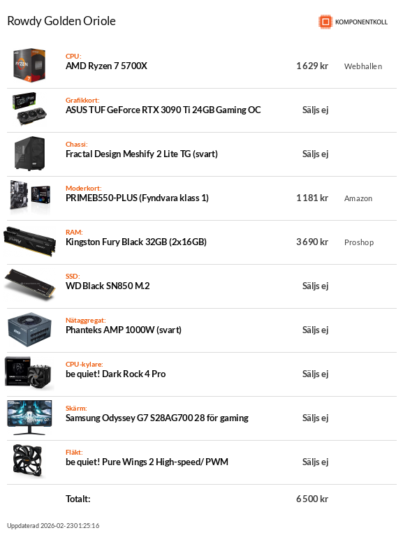 Hej, det är dags för mig att byta ut min 6 år gamla speldator och jag tänkte jag ska försöka bygga min första dator själv och skulle gärna ha lite feedback på de delar jag plockat ihop. Spelar en blandning av spel, både AAA single player spel och en del skjutspel som Destiny 2. Tänkte även att datorn skulle kunna klara en del spel i 4K.