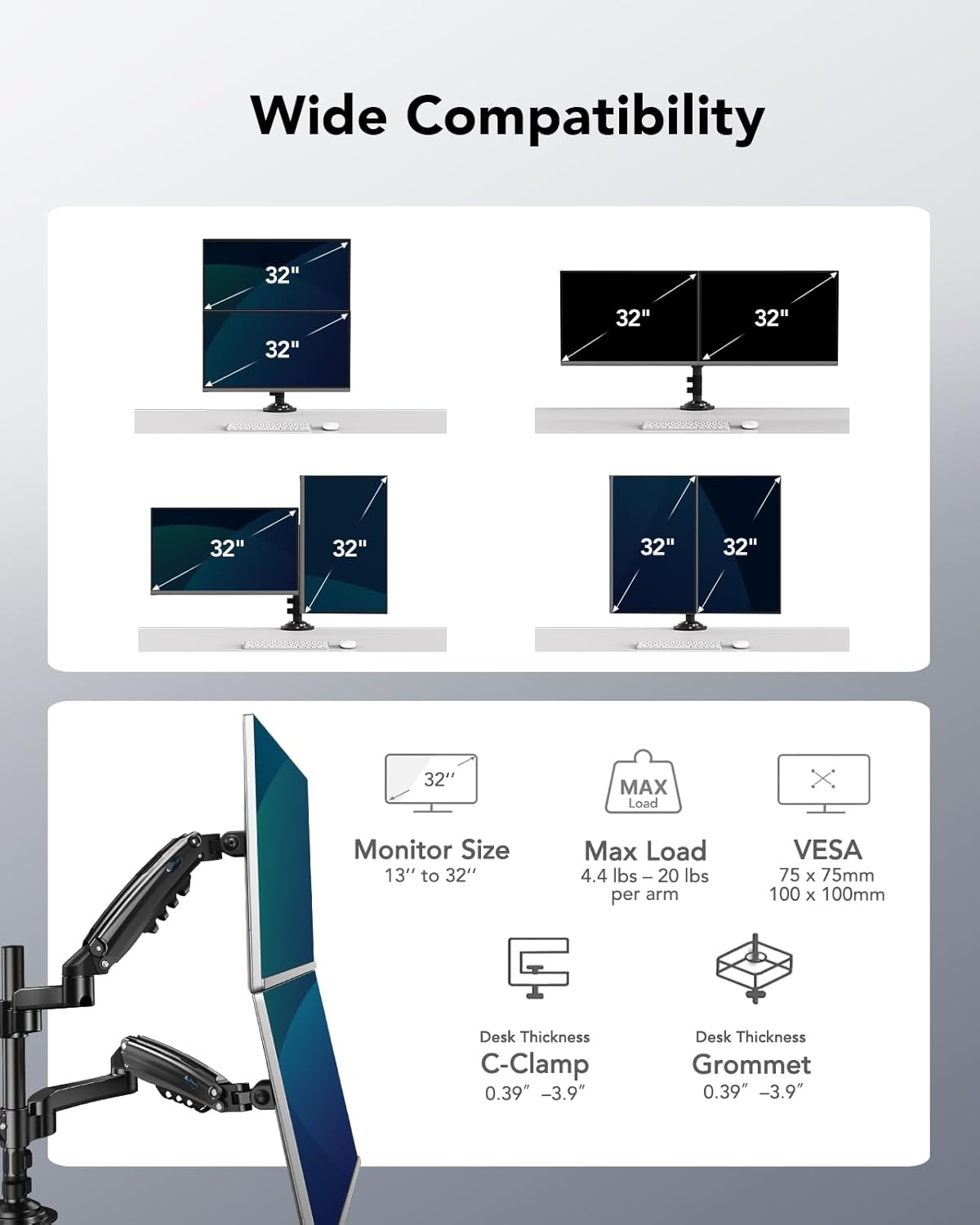 Om du menar Vertikalt som en monitor ovanför den andra så köpte jag själv nyss denna som ska funka bra för det https://www.amazon.se/-/en/gp/product/B0861284GB/?th=1