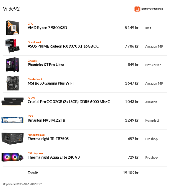 Här är dom delarna om du köper och bygger själv, jag hade dock inte kört en AIO till 9800X3D för det behövs inte så köp bara det om du tycker det är snyggare. Samma gäller RGB ram, vill du ha RGB kostar dom ca 250kr mer. Det finns ett MSI B850 GAMING PLUS WIFI6E också för ca 150kr mer men det tycker jag inte är värt det.