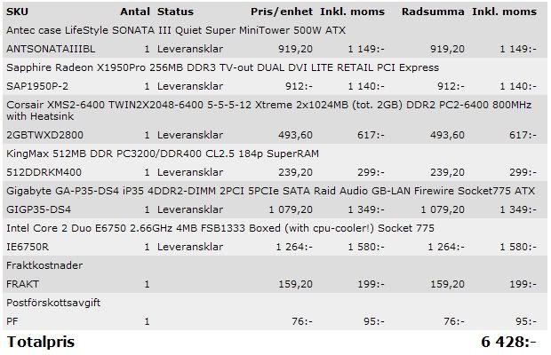 Cpu [ intel Q6600 @ 3ghz ] Minne [ 4gb pc6400 corasair ] Moderkort [ gigabyte DS3 ] Grafikkort [ HD3870 ] Hdd [ 250GB, extern 500gb ] Skärm [ HP w2207h ] Tgb [ Logitech G15 ] Mus [ Logitech G5 ] Ljud [ Creative 5.1 ]