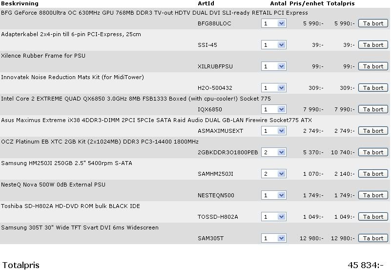 AMD 939 X2 4600+ | asus A8N-VM CSM | TwinMOS 2*1024 DDR400 cl3 | Silverstone SG01 + Tagan easyconnect 430w | Creative SB live | WD160GB + WD200GB +WD MYBOOK ES 250GB | NEC DVD-brännare | Samsung 913b(TFT) + 753s(CRT) | WACOM Intuos3 a4 |