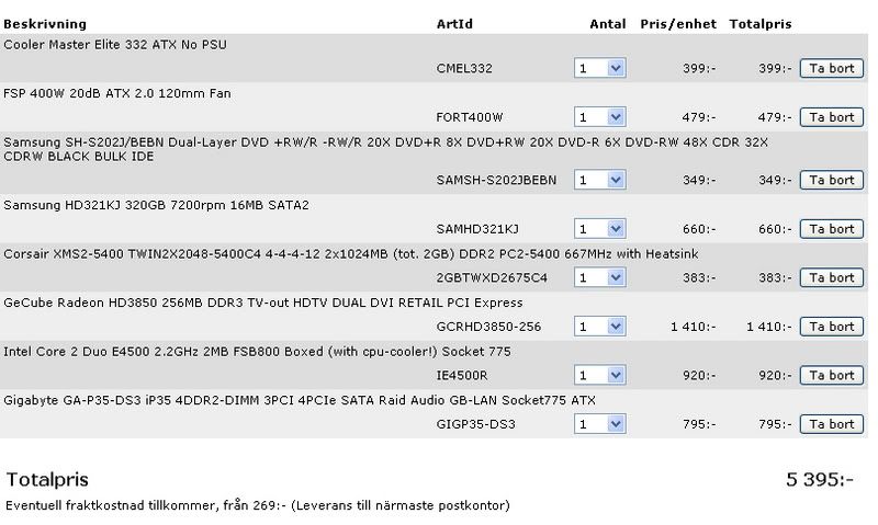 AMD 939 X2 4600+ | asus A8N-VM CSM | TwinMOS 2*1024 DDR400 cl3 | Silverstone SG01 + Tagan easyconnect 430w | Creative SB live | WD160GB + WD200GB +WD MYBOOK ES 250GB | NEC DVD-brännare | Samsung 913b(TFT) + 753s(CRT) | WACOM Intuos3 a4 |
