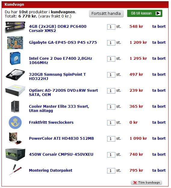 Intel E5200 4.1Ghz -|- Radeon HD4850 -|- A-Data 2x2GB PC6400 -|- MSI P43 Neo-F -|- Western Digital Caviar 320GB -|- Coolermaster Elite 333 -|- Corsair 650W