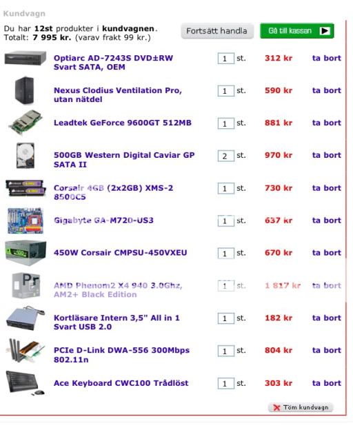 Intel i5 @ 2,66Ghz | Noctua NH-D14 | 4gb corsair 1600mhz | Asus P7P55D-E PRO | Antec p182 | Corsair 550w |Asus 6950 2gb upplåsta shaders, ASUS 5770 V2|Samsung SpinPoint F3 1 TB |Benq BL2400PT | LG 42PQ6500 | Steelseries Siberia v1 |Asus Xonar DX |Creative EP-630 | AKG K601 | Dynavoice F-6 EX 5.0 |Canton Reference 9.2 DC | Atacama Nexus 6| Onkyo 607