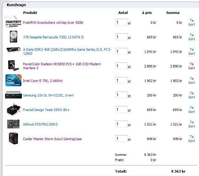 Intel Core i5 750 |Corsair Cooling Hydro H50 | Gigabyte GA-H55N-USB3 Mini-ITX |Corsair 4GB 1600MHz | XFX Radeon HD5850 1GB Black Edition | Corsair SSD Force Series 120GB | Silverstone Sugo SG07B | Win7 Professional 64bit |