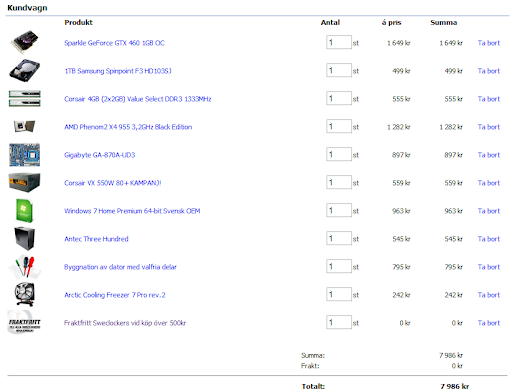 CPU: AMD Phenom II X4 955 / MB: Gigabyte GA-870A-UD3 / GPU: Gigabyte Geforce GTX 660 Ti / Nätagg: Corsair VX 550 80+ / 16 Gb RAM / 1TB Samsung Spinpoint F3 HD103SJ // Ipad mini 2 //