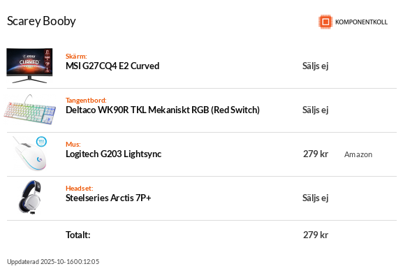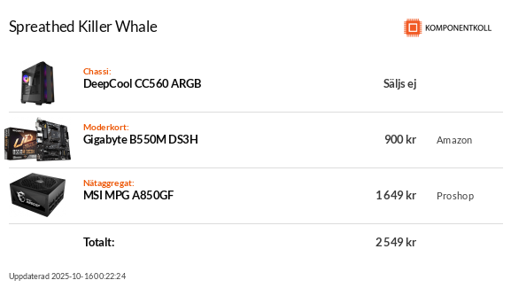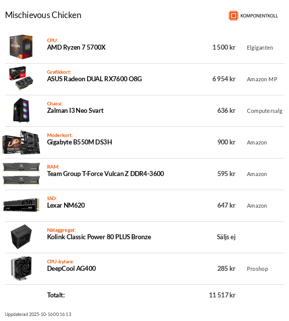 Detta är vad jag hade byggt. Samma prestanda som ditt bygge för lite mindre. Och du får saker som ett bättre moderkort också. Du kan också investera i ett bättre grafikort nämligen 6700xt. Det blir 1k mer men kommer hålla ett tag till.
