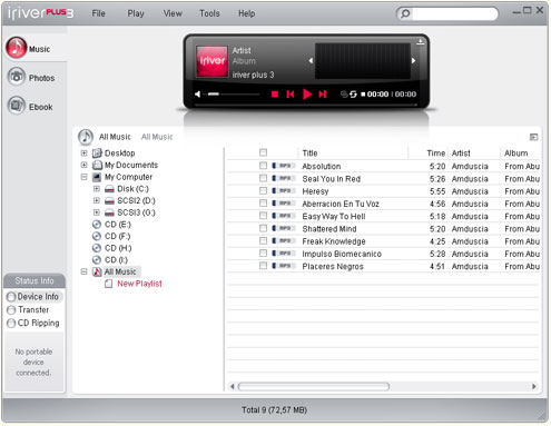 Med det medföljande programmet Iriver Plus 3 kan man föra över filer till mp3-spelaren. Man kan även skapa spellistor. Programmet är inte nödvändigt för att föra över filer.