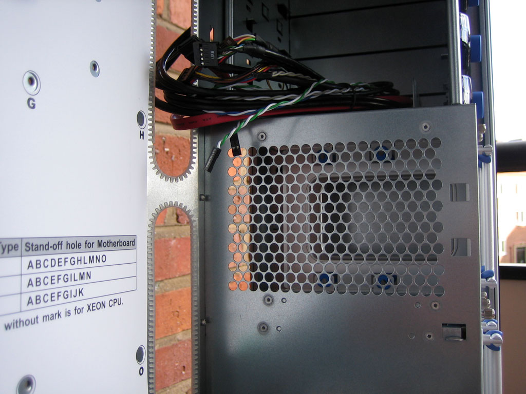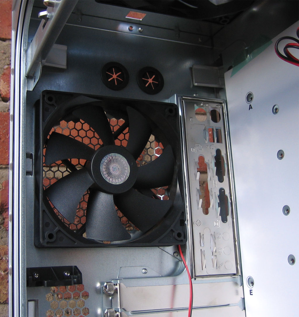 Där nätaggregatet vanligtvis sitter på mer normalt utformade datorlådor finns ytterligare en 120 mm-fläkt. Fläkten är strategiskt placerad precis bredvid processorn. Ovanför fläkten syns två slanghål som är till för externa vattenkylningslösningar.