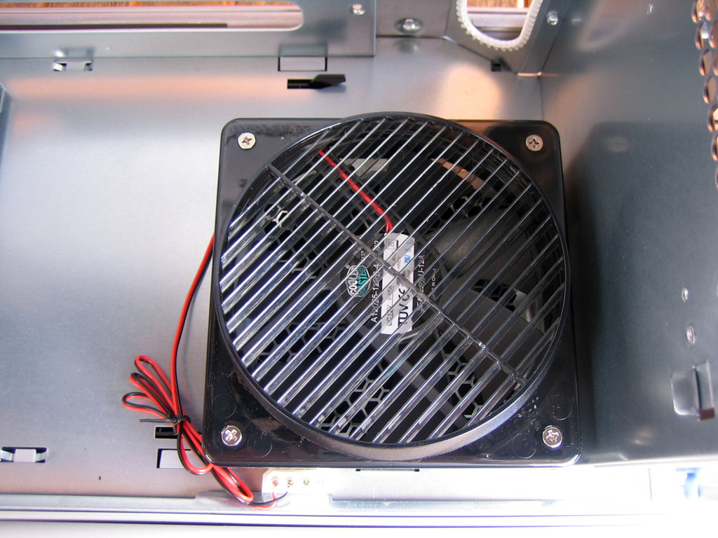 Lådans tak håller två stora 120 mm-fläktar. Som om inte det vore nog finns det skruvhål till ännu större 140 mm-modeller. Området runt processorn kyls alltså av hela tre stycken fläktar.