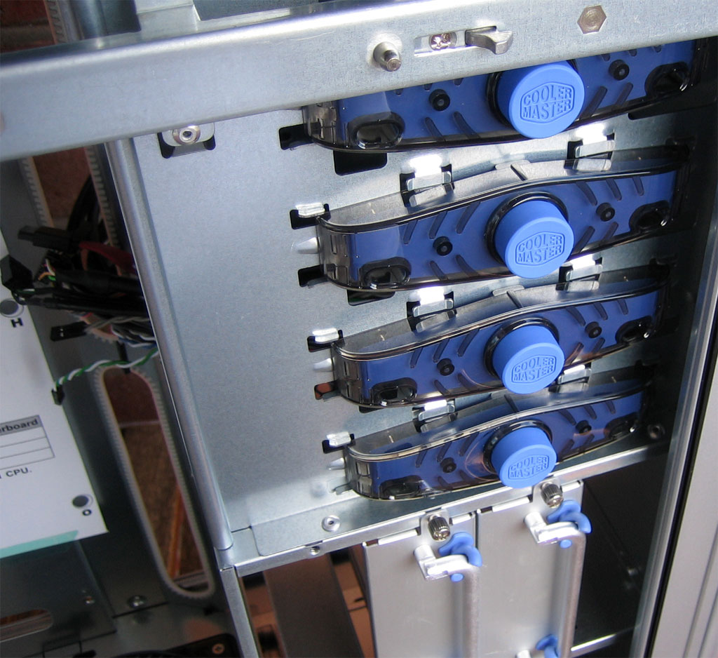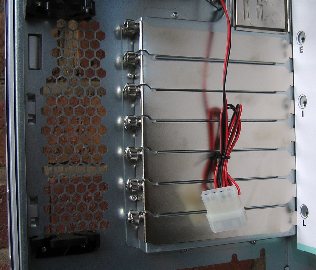Hårddiskracket kyls inte av någon dedikerad fläkt, utan tillverkaren förlitar sig på stora områden ventilationshål. Det går visserligen att flytta bottenfläkten till ventilationshålet här, men detta bör inte vara nödvändigt så länge man inte använder sig av väldigt många hårddiskar.