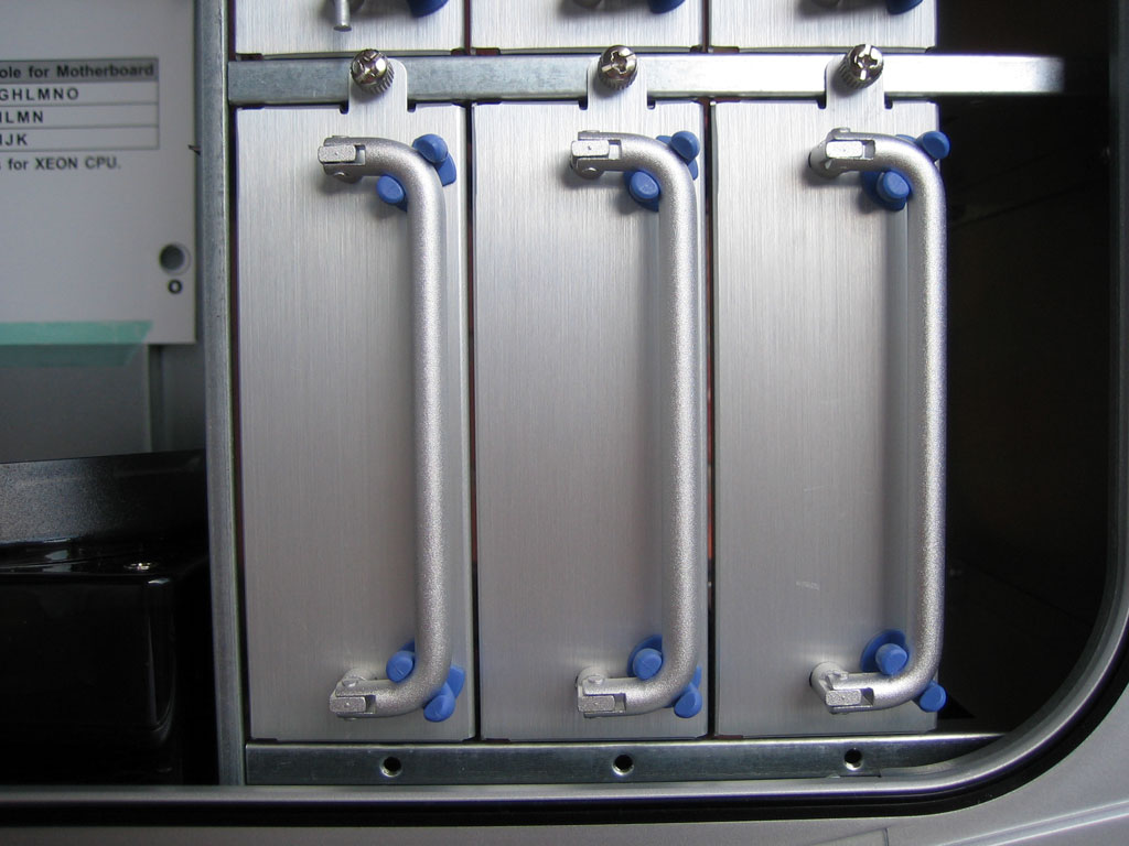 Hårddiskar monteras i speciella aluminiumkassetter för att göra det möjligt att lätt flytta på en lagringsenhet. Kassetterna sitter fast med hjälp av tumskruvar och har dessutom ordentligt handtag. För att undvika skrammel finns där även små plastlås som håller handtagen i ett stadigt grepp.