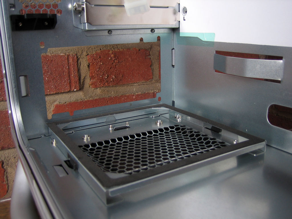 Som vi tidigare märkt monteras nätaggregatet i botten av datorlådan. Enheten skruvas fast precis som vanligt, men vilar på en specialkonstruerad metallram som dessutom försetts med vibrationsdämpande skumgummi. Tanken bakom konstruktionen är att nätaggregatet skall kunna kylas med sval luft från utsidan av lådan. Som om inte det vore nog så skyddas dessutom ventilationshålen av ett dammfilter på undersidan av chassiet.