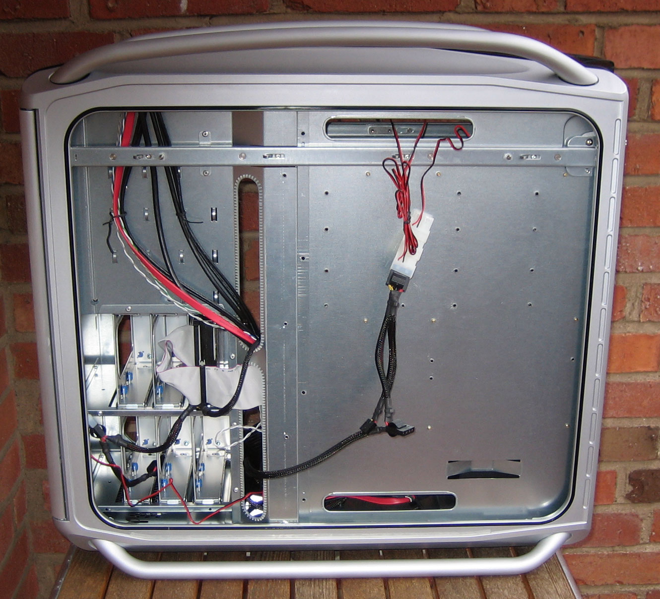 Eftersom hårddiskarna ansluts från högersidan av datorlådan är det inte lämpligt att använda gamla pata-enheter. Det går visserligen med en eller två sådana hårddiskar, men hela chassiet är mer eller mindre anpassat för den betydligt smidigare standarden serial-ata.