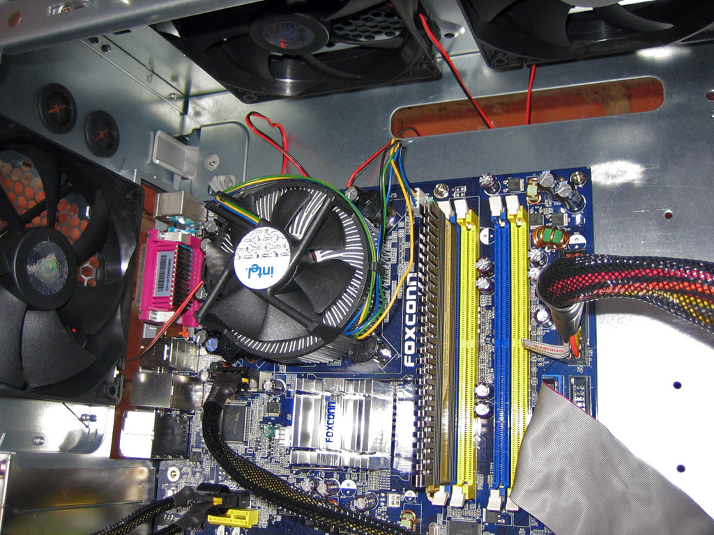 Efter att moderkortet sitter som det ska är det dags att fästa nätaggregatet. Enheten skruvas fast precis som vanligt i den bakre plåten och fläkten riktas nedåt mot ventilationshålen. Allting sitter riktigt stadigt och skumgummiremsan ser till att den tunga enheten inte börjar vibrera mot metallramen. Eftersom nätaggregatet är placerat på botten av lådan kan det bli problem med kabellängderna. Tillverkaren har förutsett detta och skickar med en 8-pins förlängningskabel till strömkontakten på moderkortet.