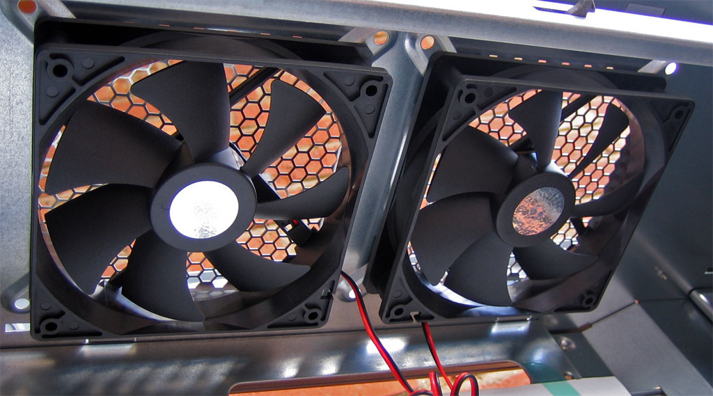 Cooler Master Cosmos innehåller fyra 120 mm-fläktar direkt från fabrik. Enligt specifikationerna finns det dessutom utrymme att installera ytterligare en likadan fläkt, men var denna ska placeras framgår inte. Visserligen råder det ingen brist på ventilationshål där en fläkt skulle passa perfekt, men det finns inga skruvhål så själva fästet får man fundera ut själv.