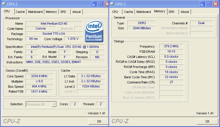 Här ser vi överklockningsresultatet med Inno 3D (E2140). Även om det går att ställa in minnesfrekvensen separat kan man inte säga att minnesfrekvensen är helt oberoende av processorn. Nforce-styrkretsen använder sig av en mängd olika inställningar (dividers) som i detta fall försöker göra att minnesfrekvensen blir 800 MHz. Denna gång fanns det tyvärr ingen bra fördelning och detta resulterade i att vi fick en minnesfrekvens på 758,4 MHz (379,2 x 2).