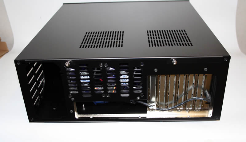 Baksidan av lådan ser ut som på vilken pc som helst med undantaget att den är helt svartmålad för att passa resten av lådan. De två 80 mm-fläktar som medföljer sitter längst bak. De är av märket Coolage. Tyvärr har vi inte hittat mer information om dessa. Vi ser också på denna bild VGA-kabeln för LCD-skärmen. Den kommer inifrån lådan och ska anslutas antingen till ett externt grafikkort eller till moderkortet.