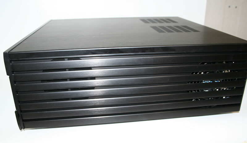 Vi kan ana två fläktgaller på höger sida av lådan. Det främre gallret, till vänster i bilden, sitter i höjd med där två av de interna 3.5”-platserna sitter och motsvaras av ett liknande galler på vänster sida. Det är här vi kan sätta de två ytterligare 80 mm-fläktarna som passar in i lådan för att kyla eventuella hårddiskar. Det bakre fläktgallret sitter bredvid nätaggregatet och motsvaras av ett liknande galler på andra sidan lådan.
