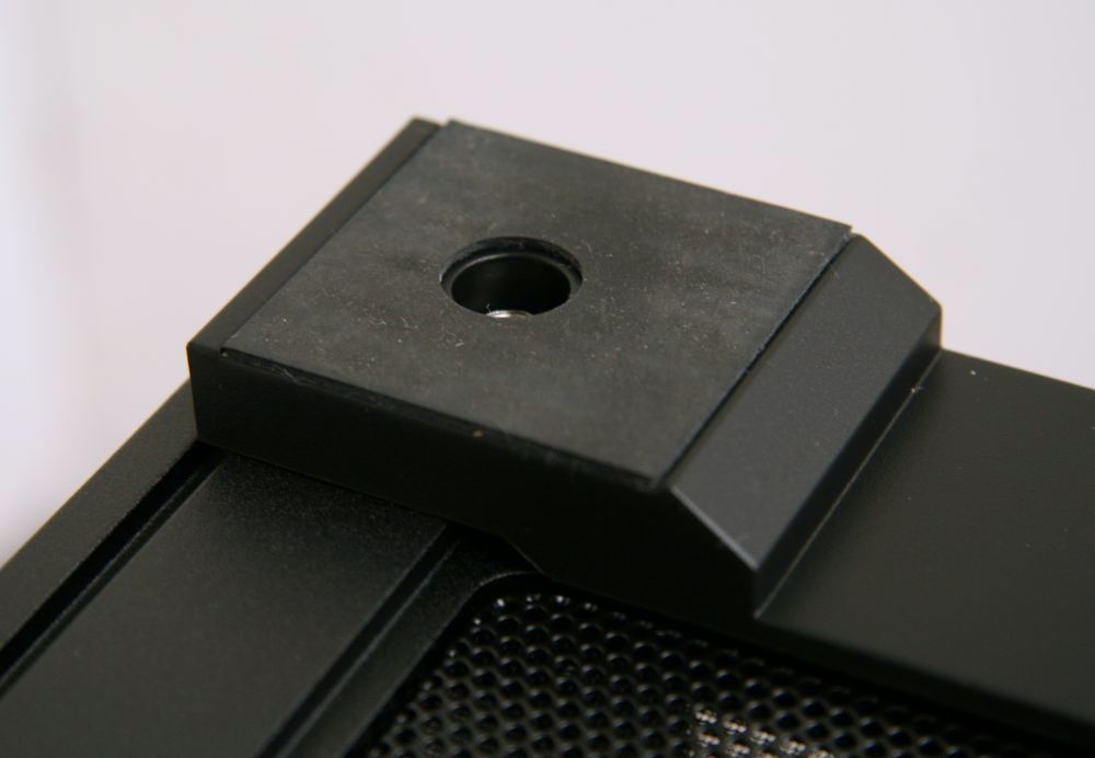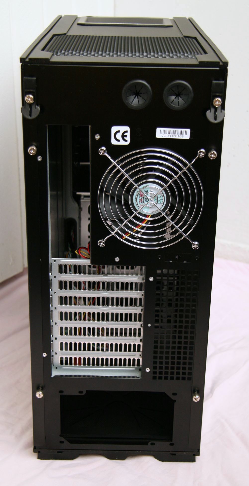 När vi rör oss vidare till chassits baksida ser vi att större delen är svartmålad. Längst upp ser vi öppningar för vattenkylning och nedanför dessa en 120-millimetersfläkt. Fläkten blåser ut varm luft ur chassit och täcks utav ett fläktgaller. Gallret är enkelt att avlägsna om så önskas. Plåtarna som täcker platserna för expansionskort är alla perforerade för att öka ventilationen av varma instickskort. Längst ner på chassit hittar vi utrymmet för nätaggregatet. Observera att varje sidoplåt hålls på plats av tre tumskruvar.