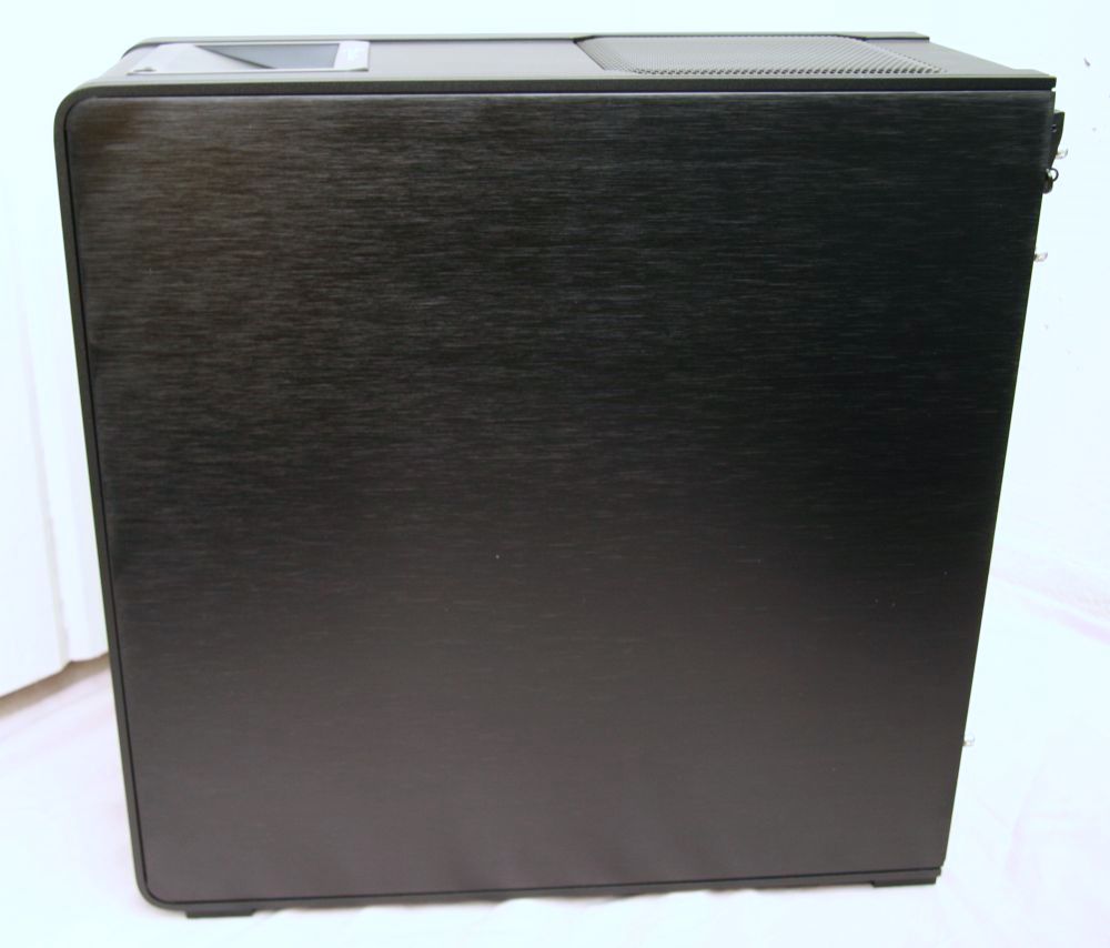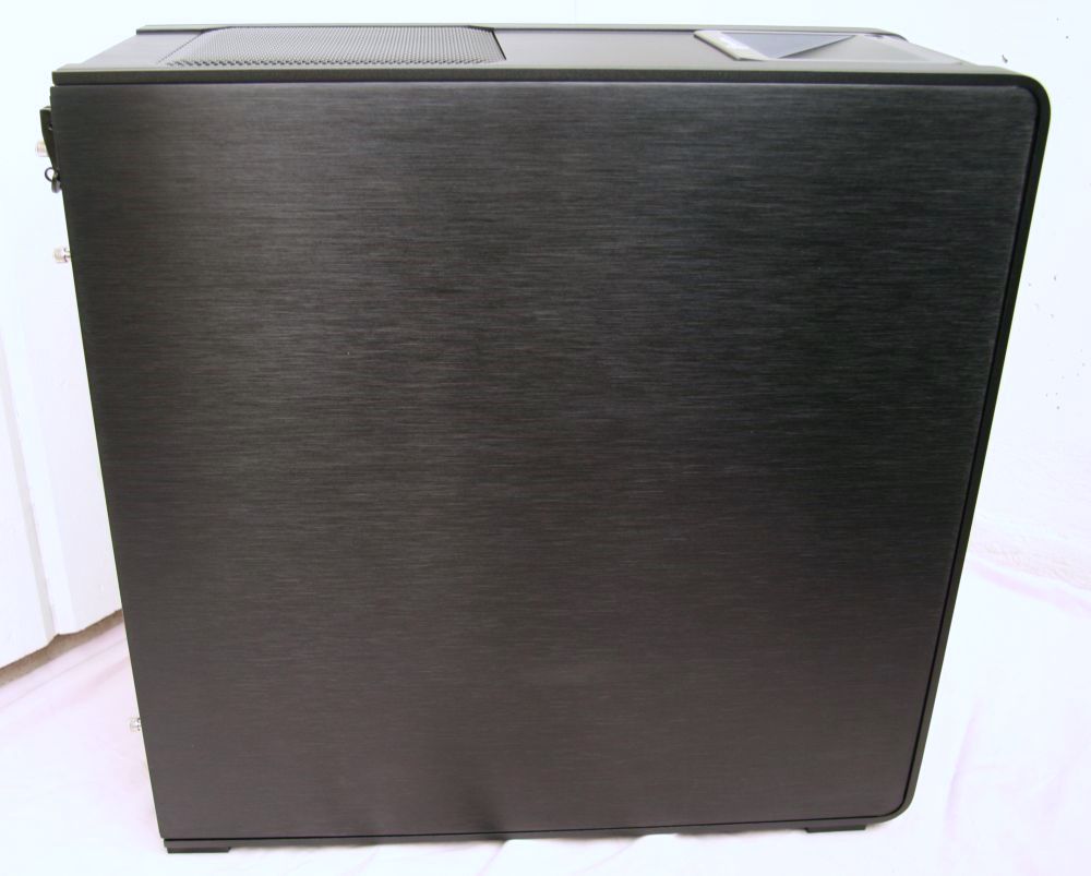 Den vänstra sidoplåten är helt slät och saknar ventilationsöppningar. Aluminiumytan är borstad.