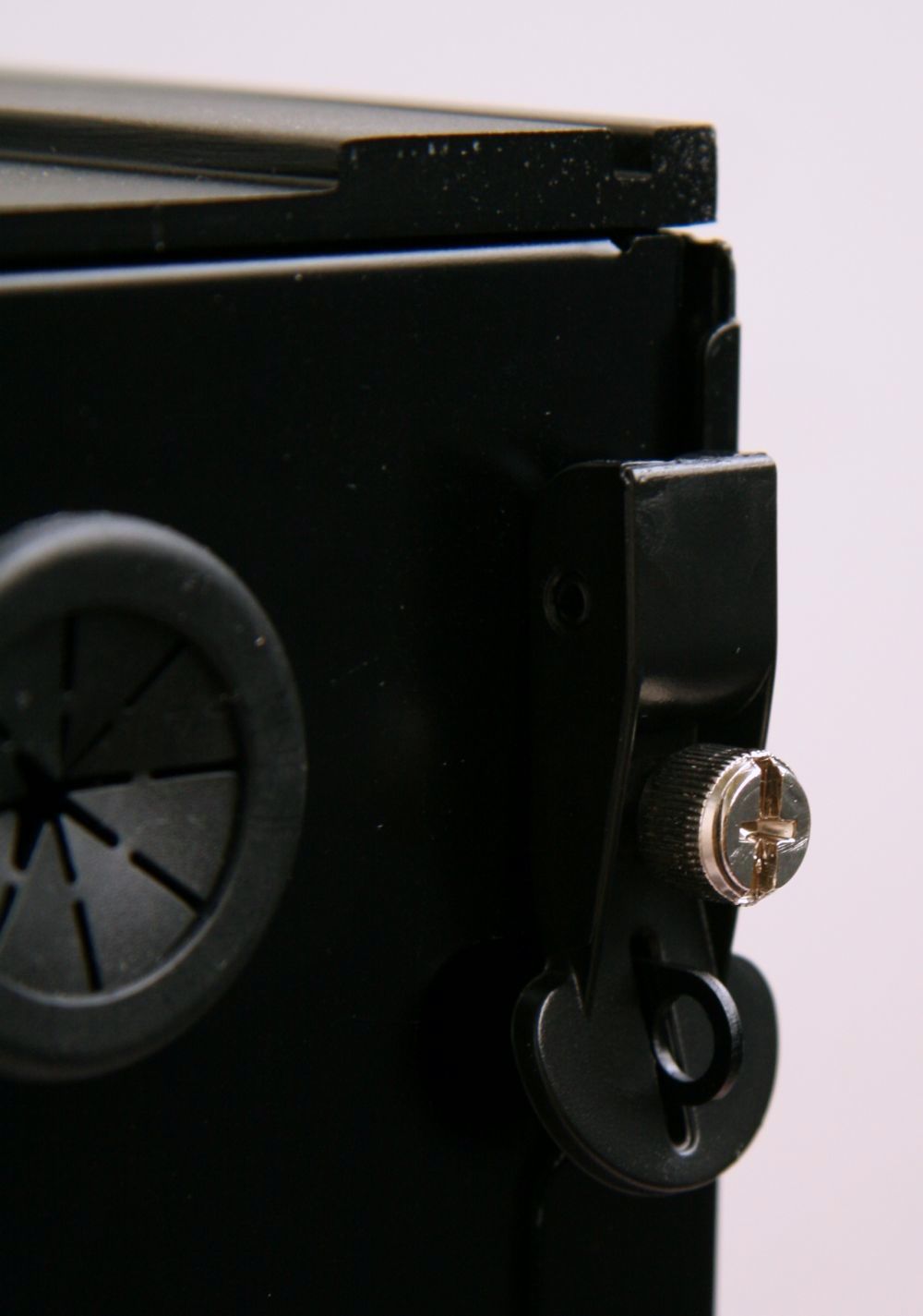 Den översta tumskruven på varje sidoplåt håller fast en låsanordning. Här är det möjligt att sätta fast ett vanligt hänglås för ökad säkerhet. Mer om själva låsanordingen senare i recensionen.