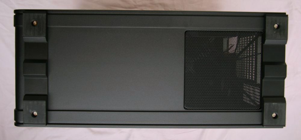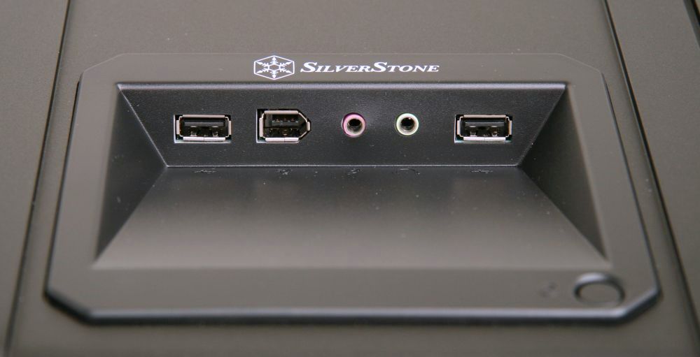 Längst fram på takpartiet hittar vi den främre I/O-panelen. Vi ser två stycken USB 2.0-portar, firewire samt in- och utgång för ljud. Förvånande är att Silverstone valt att inte inkludera E-SATA. Det borde vara lika självklart som USB-portar idag, särskilt på ett chassi i denna prisklass.